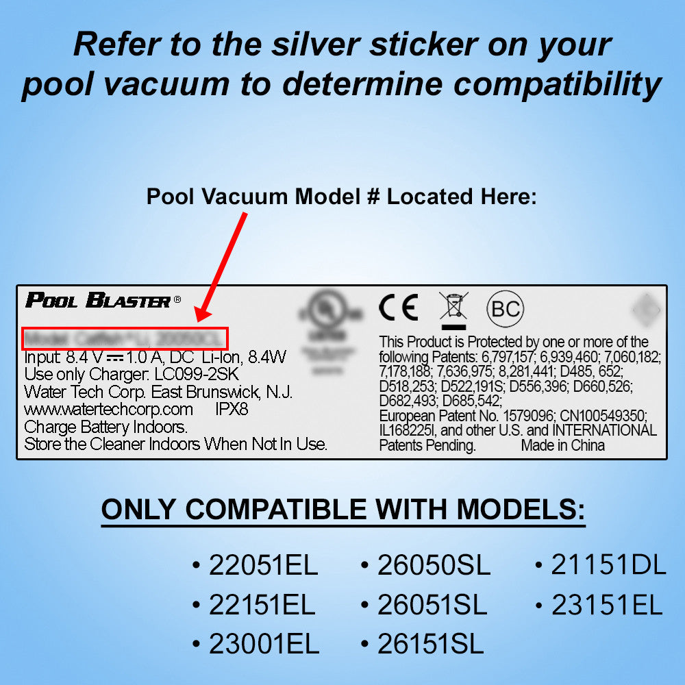 - Compatible with the pool vacuums under the following Model Numbers (could be found on the silver sticker on your unit): 22051EL, 22151EL, 23001EL, 23151EL, 26050SL, 26051SL, 26151SL, 21151DL or 20150CL